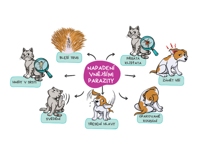 Vnější paraziti, jako jsou blechy nebo klíšťata, dokážou vašemu psovi nebo kočce značně znepříjemnit život. Naučte se rozpoznat příznaky a zjistěte, jak své mazlíčky chránit. Klikněte na “Více informací” a podívejte se, kteří paraziti jsou nejčastější a jak zajistit, aby se váš mazlíček cítil dobře a v bezpečí.